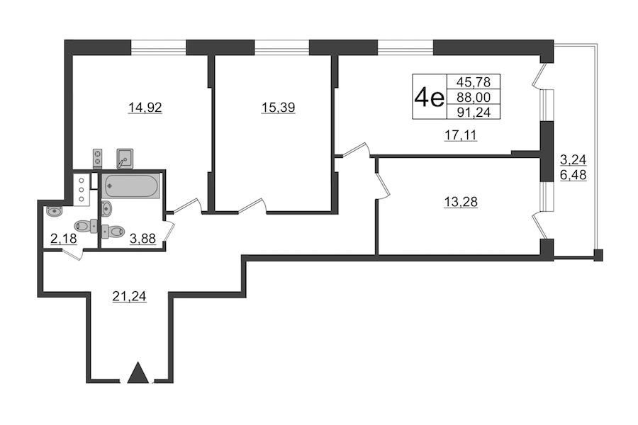 Трёхкомнатная квартира на 13-ом этаже 91,24 кв.м