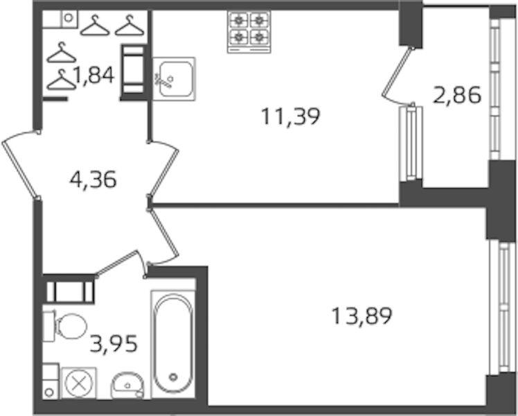 - Площадь кухни11,39 м2