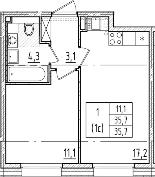 - Площадь35,7 м2