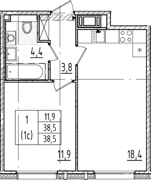 - Площадь38,5 м2