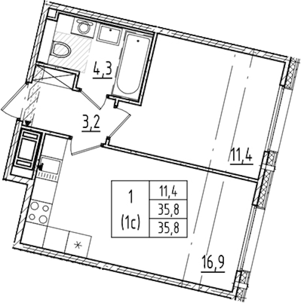 Однокомнатная квартира на 9-ом этаже 35,8 кв.м