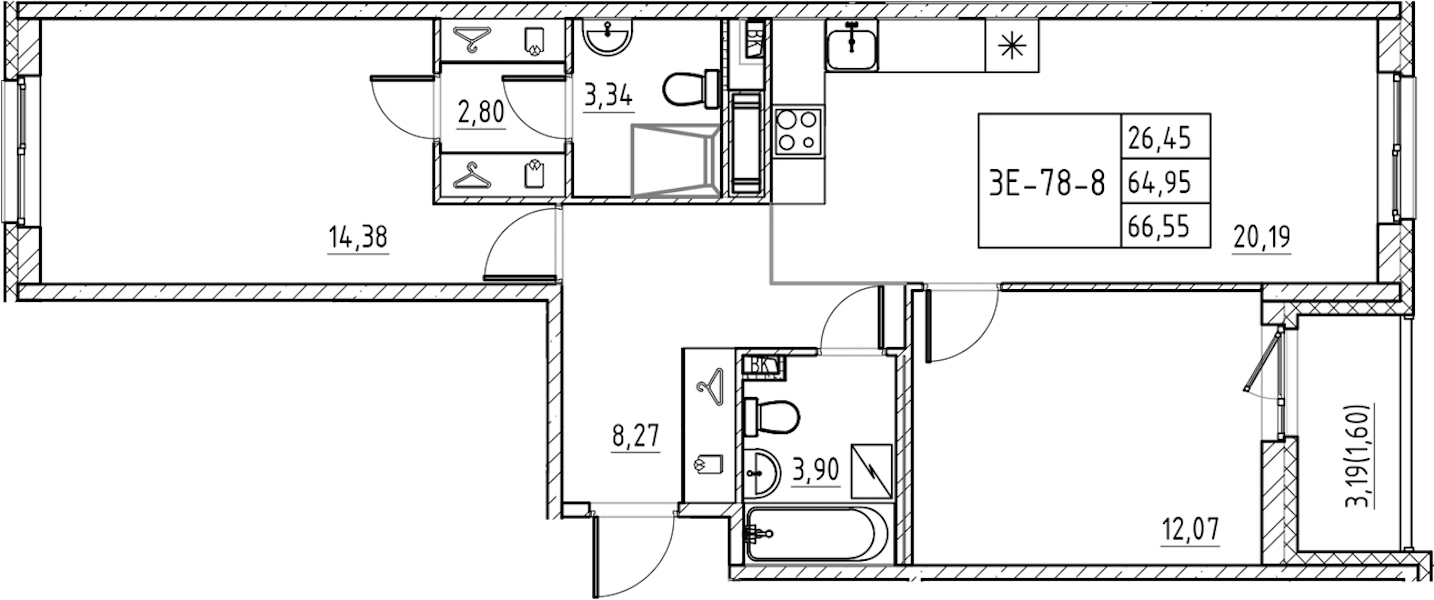 Двухкомнатная квартира на 4-ом этаже 66,55 кв.м