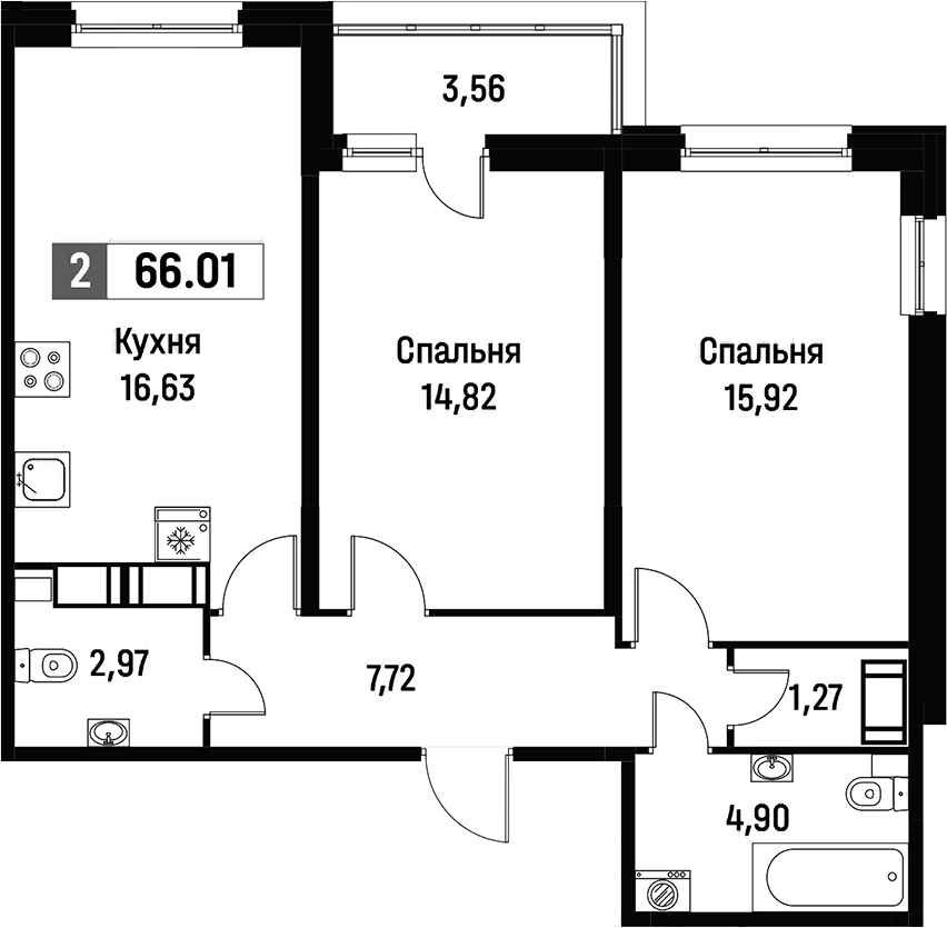 Двухкомнатная квартира на 2-ом этаже 66,01 кв.м