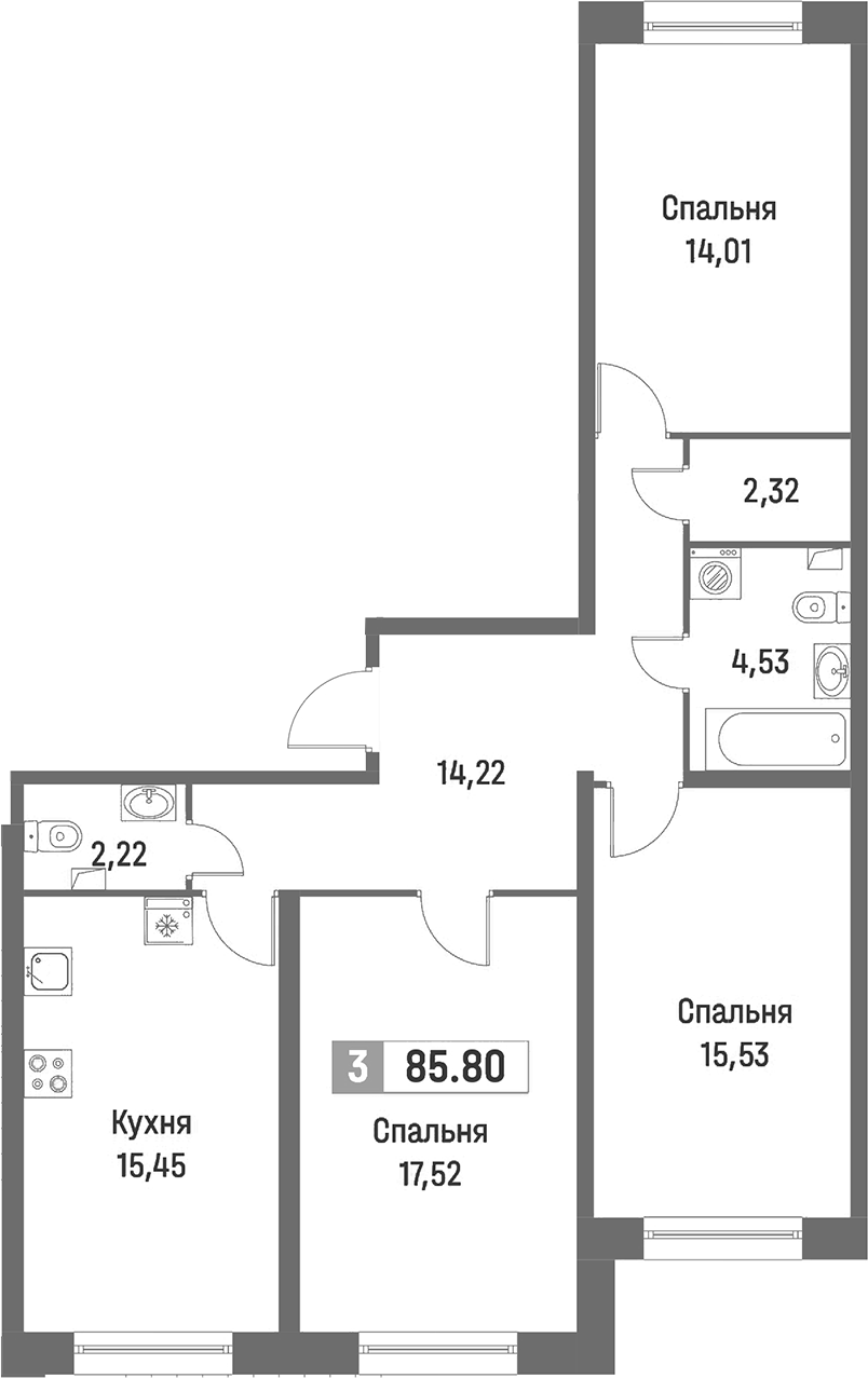- Площадь кухни15,45 м2