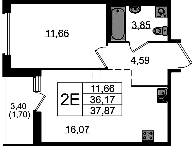Однокомнатная квартира на 12-ом этаже 37,87 кв.м