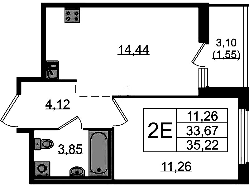 Однокомнатная квартира на 14-ом этаже 35,22 кв.м
