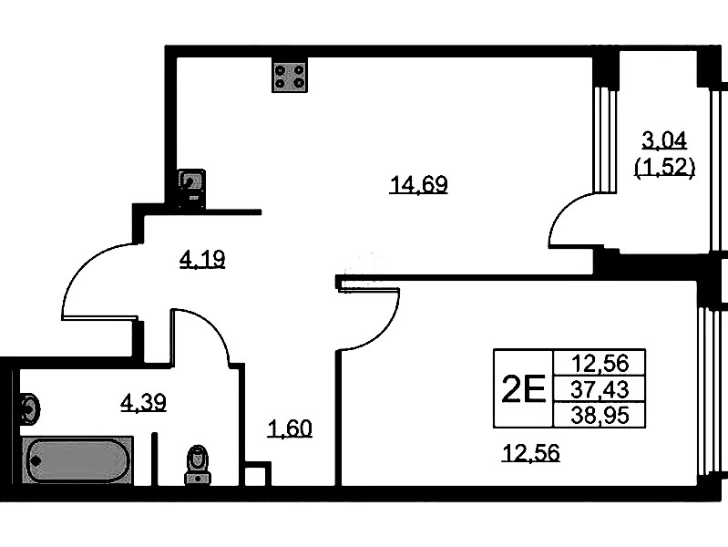 Однокомнатная квартира на 14-ом этаже 38,95 кв.м