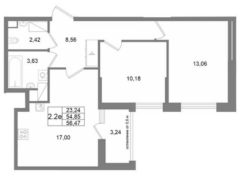 Двухкомнатная квартира на 12-ом этаже 54,85 кв.м