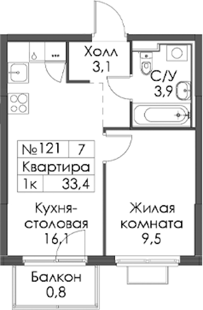 - Площадь33,4 м2