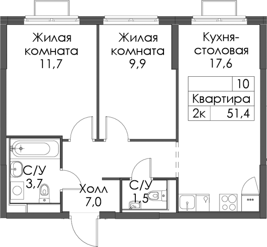 - Площадь51,4 м2