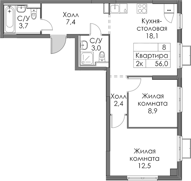 - Площадь кухни18,1 м2
