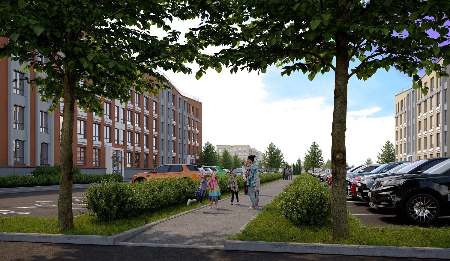 • Олимпийский стиль. Для фасадов выбраны теплые оттенки бежевого и терракотового спектра. Это подчеркнет близость квартала к пригородам и создаст ощущение гармонии. Парапеты домов имеют уклоны, фасады украшают декоративные пояса, а под окнами располагается рустовка.