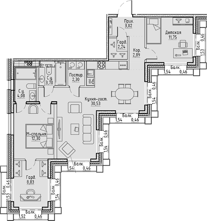 - Площадь кухни30,53 м2