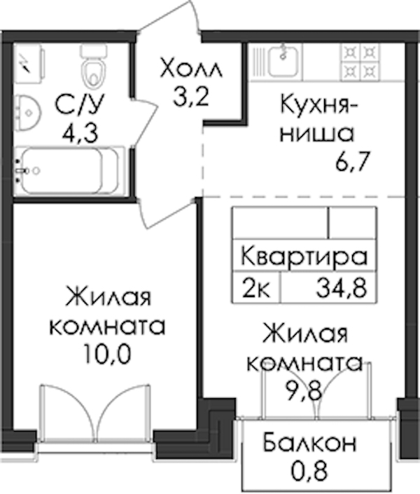• Площадь34,8 м2