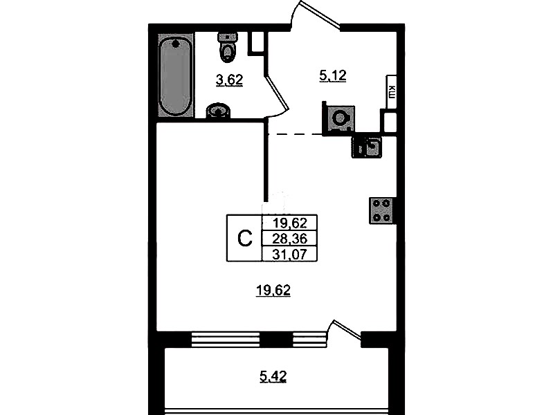 Квартира-студия на 5-ом этаже 31,07 кв.м