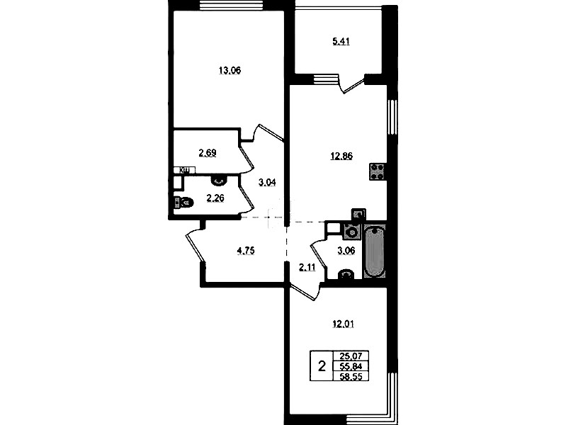 - Площадь58,55 м2