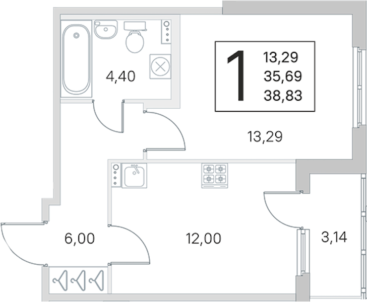 Однокомнатная квартира на 1-ом этаже 35,69 кв.м