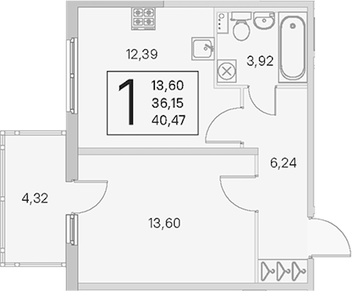 - Площадь кухни12,39 м2