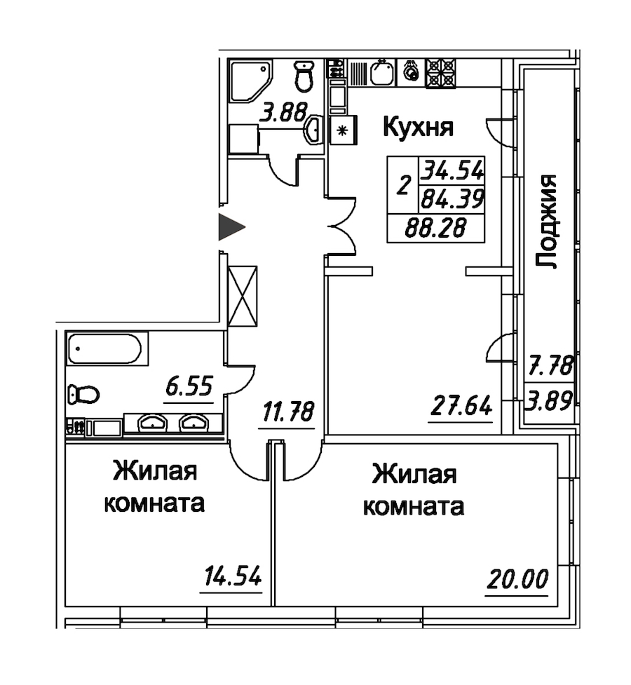 Двухкомнатная квартира на 5-ом этаже 88,28 кв.м