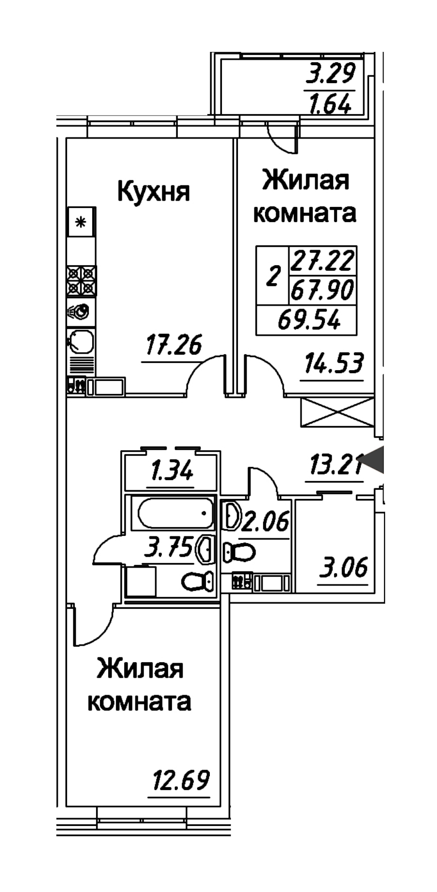 Двухкомнатная квартира на 8-ом этаже 69,54 кв.м