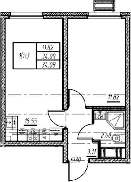 Однокомнатная квартира на 4-ом этаже 34,08 кв.м