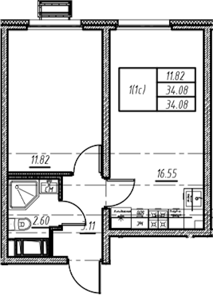 Однокомнатная квартира на 5-ом этаже 34,08 кв.м