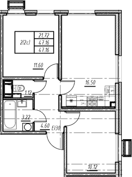Двухкомнатная квартира на 12-ом этаже 47,16 кв.м