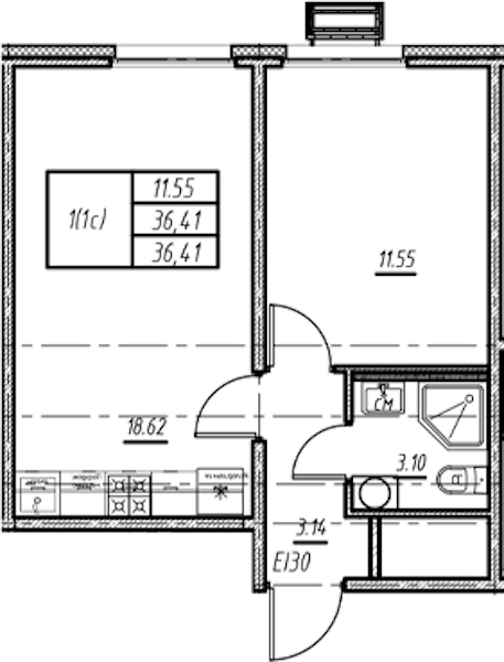 Однокомнатная квартира на 22-ом этаже 36,41 кв.м