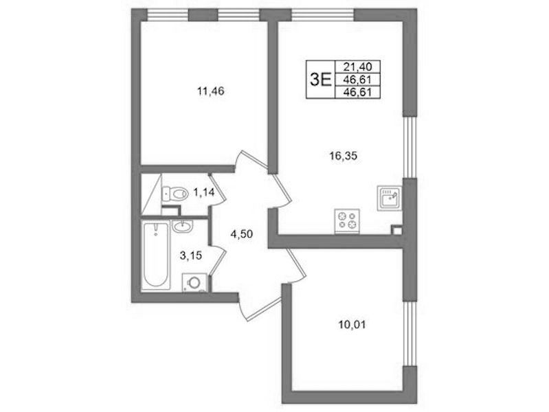 Двухкомнатная квартира на 6-ом этаже 46,61 кв.м