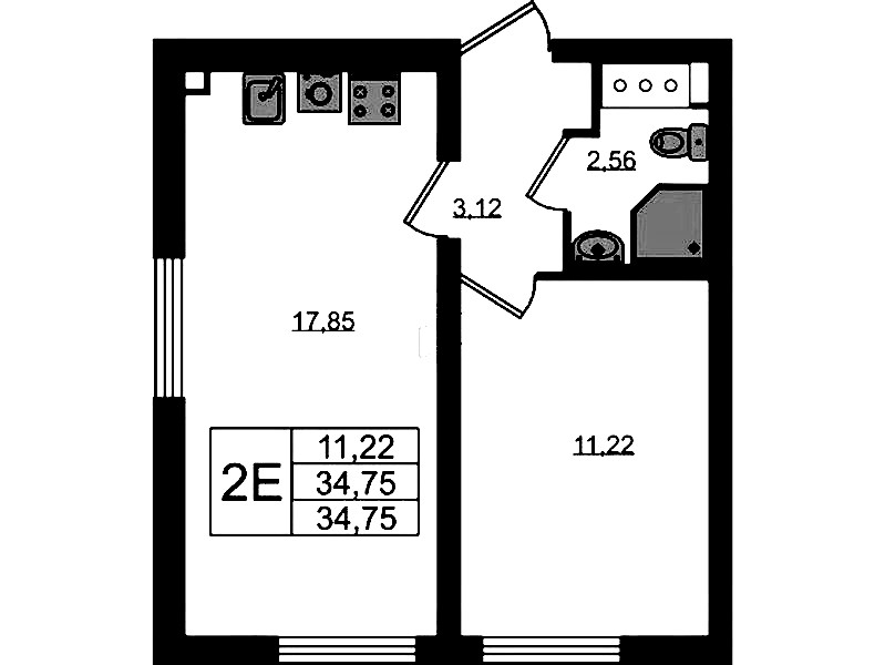 Однокомнатная квартира на 19-ом этаже 34,75 кв.м