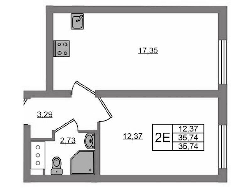 Однокомнатная квартира на 13-ом этаже 35,74 кв.м