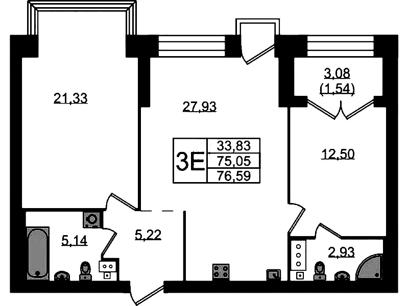 Двухкомнатная квартира на 11-ом этаже 76,59 кв.м