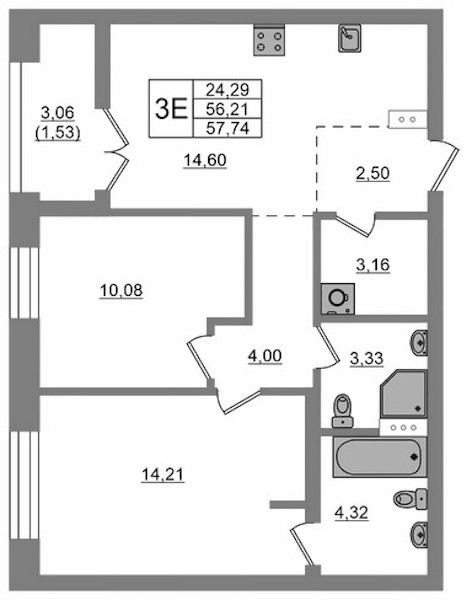 - Площадь57,74 м2