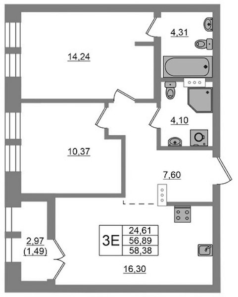 - Площадь58,38 м2