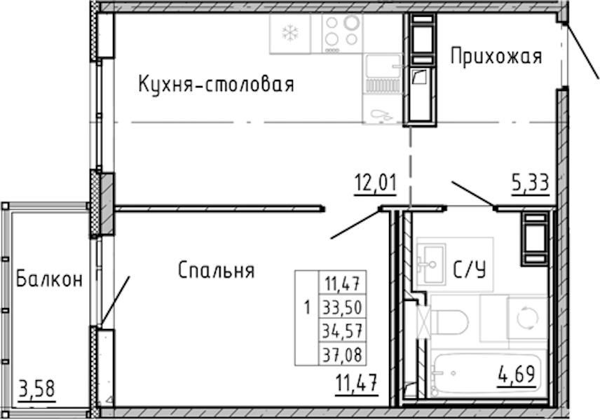 - Площадь кухни12,01 м2