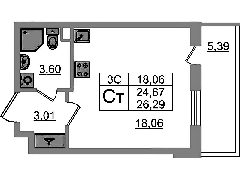 Квартира-студия на 3-ем этаже 24,67 кв.м