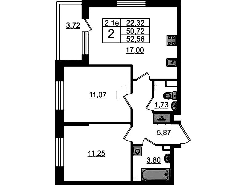 Двухкомнатная квартира на 3-ем этаже 50,72 кв.м