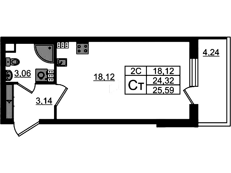 Квартира-студия на 4-ом этаже 24,32 кв.м