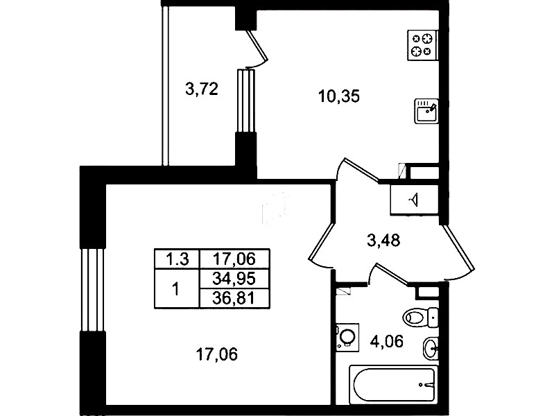 Однокомнатная квартира на 3-ем этаже 34,95 кв.м