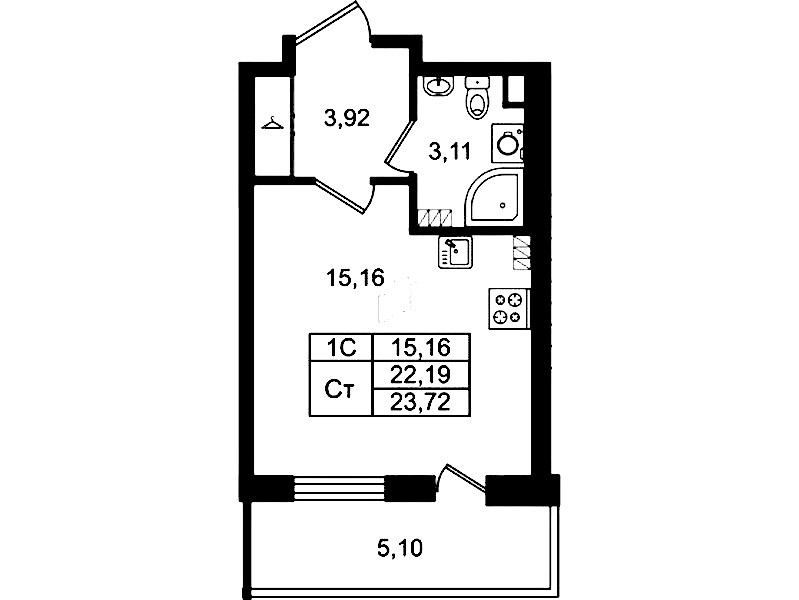Квартира-студия на 5-ом этаже 22,19 кв.м