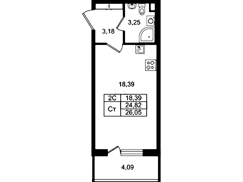 Квартира-студия на 2-ом этаже 24,82 кв.м