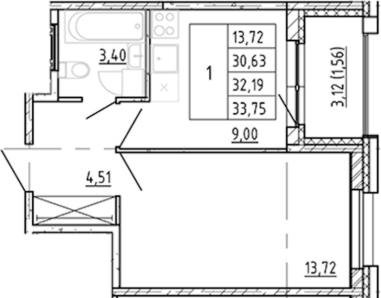 Однокомнатная квартира на 4-ом этаже 30,63 кв.м
