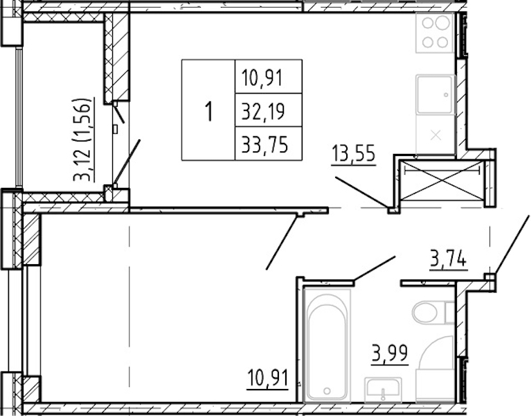 Однокомнатная квартира на 8-ом этаже 32,19 кв.м