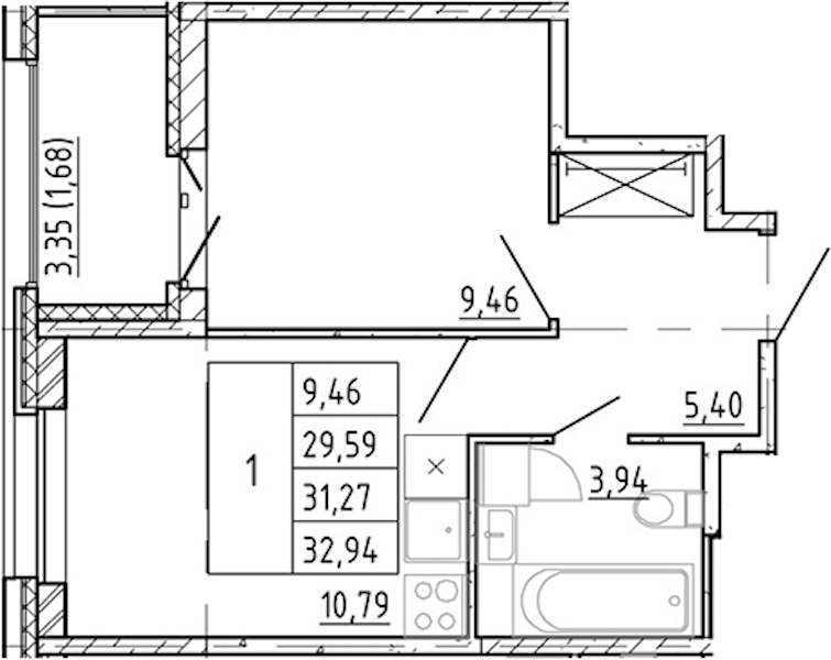 Однокомнатная квартира на 11-ом этаже 29,59 кв.м