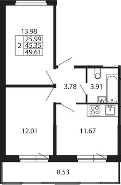 - Площадь45,35 м2