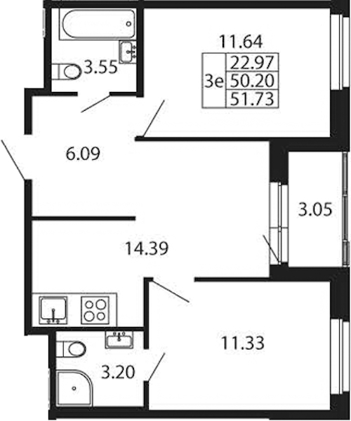 - Площадь кухни14,39 м2
