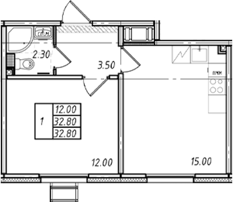 Однокомнатная квартира на 12-ом этаже 32,8 кв.м