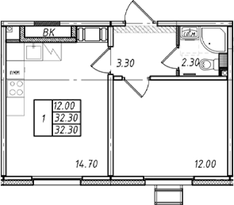 Однокомнатная квартира на 14-ом этаже 32,3 кв.м