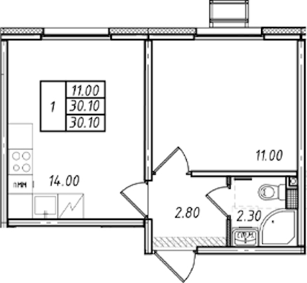 Однокомнатная квартира на 5-ом этаже 30,1 кв.м