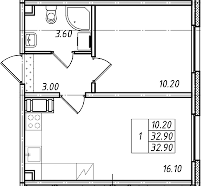 Однокомнатная квартира на 7-ом этаже 32,9 кв.м